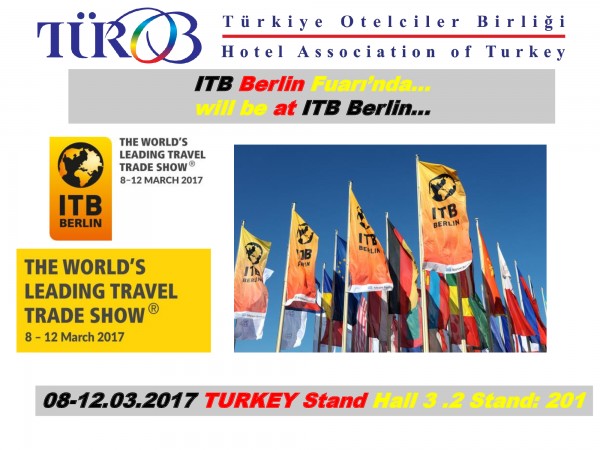 Türkiye Otelciler Birliği (TÜROB) üst yönetimi bu kez de Türkiye’nin en büyük turizm pazarlarından biri olan Almanya’da temaslarda bulunacak. TÜROB Başkanı Timur Bayındır, 8-12 Mart tarihlerinde deki ITB Berlin Turizm Fuarı’nda 2017 yılının en yakın öngörülerini elde edeceklerini belirtti. Bayındır, Sayın Cumhurbaşkanı Recep Tayyip Erdoğan’ın başlattığı ‘Komşunu al gel’ kampanyası açısından da fuardaki tanıtım faaliyetlerinin somut ve verimli sonuçlar getirmesini beklediklerini dile getirdi.